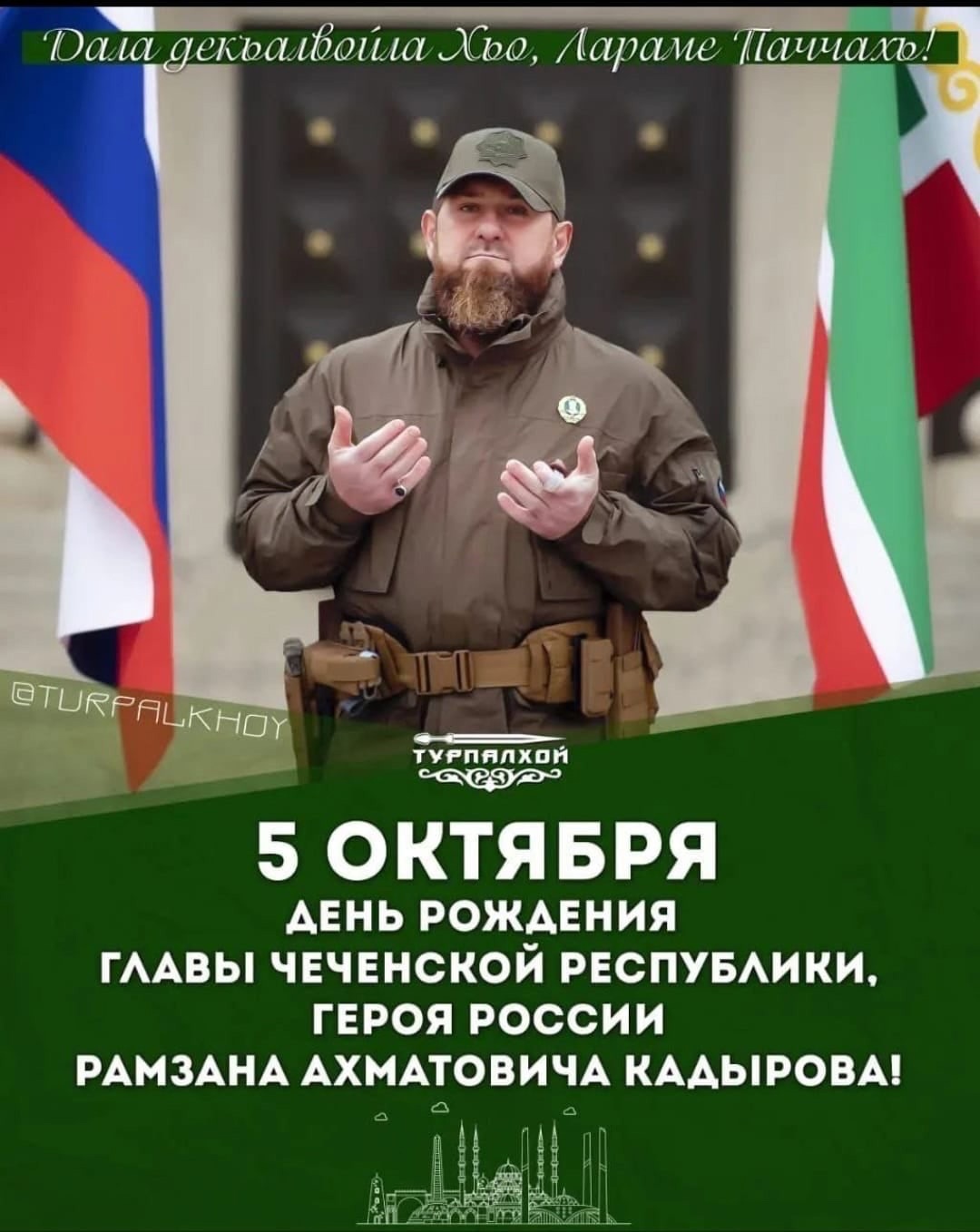 05.10.2024Сегодня свой день рождения отмечает Лидер Чеченского народа, гордость нации, Служитель священного Корана, Глава Чеченской Республики, Герой России, Герой ДНР Рамзан Ахматович Кадыров.Мы искренне благодарны Вам за все, что Вы сделали и делаете для благополучия Чеченской Республики и чеченского народа! Желаем Вам успехов во всех ваших благих делах, достижения новых высот на политическом поприще. Добра, счастья и благополучия Вам, Вашим родным и близким! Да будет доволен Вами Аллах1!